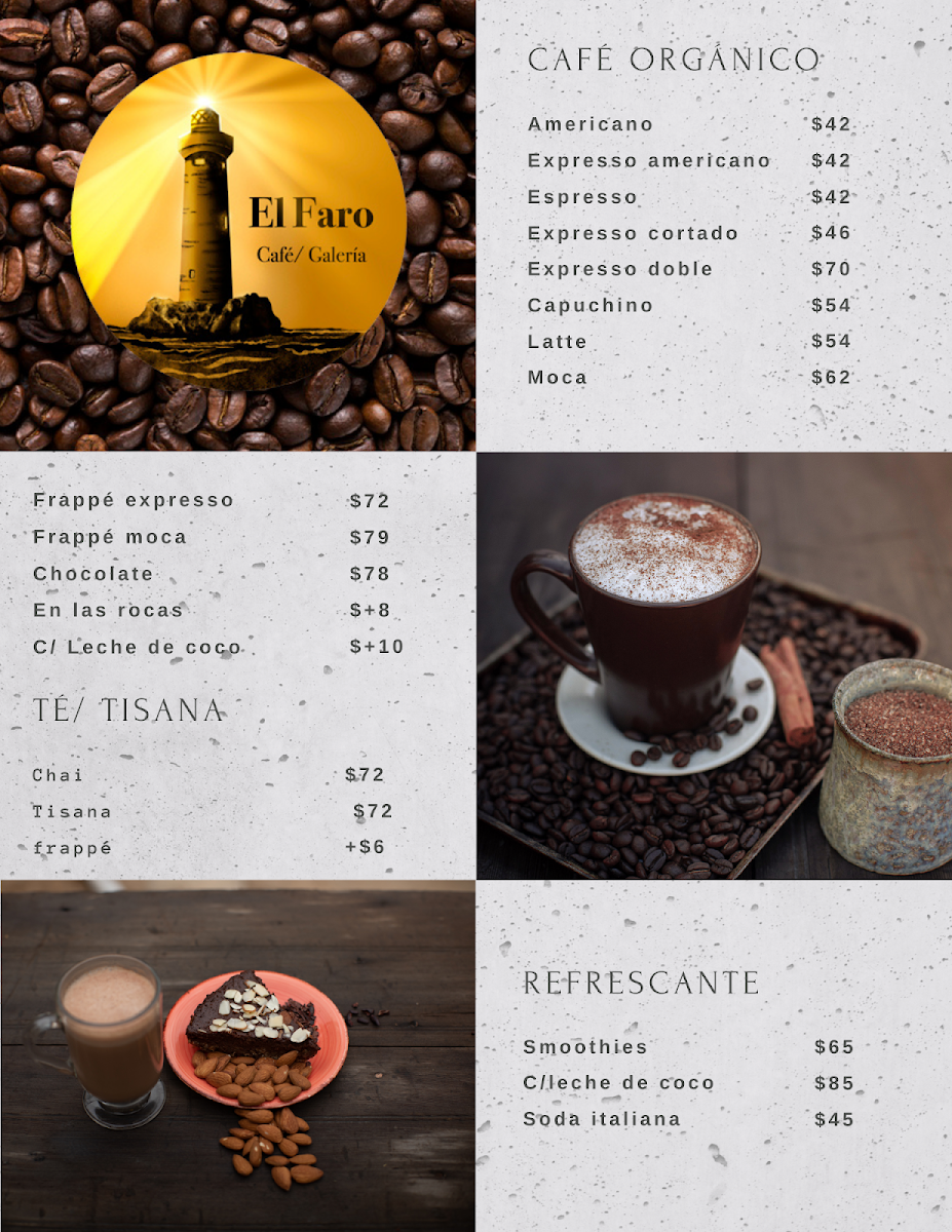 El Faro Cafe-Galeria takes pride in its menu of carefully crafted beverages. You can start your day with a rich Americano or indulge in a frothy Cappuccino, artfully prepared at just MX$54. For those with a sweet tooth, the Mocha (MX$62) provides a luscious treat, perfectly paired with their delectable array of desserts, including the tempting Espresso cake or the creamy Pay De Queso (both at MX$65). If you’re in the mood for something refreshing, their smoothies (MX$65) are a delightful way to cool off, especially with options featuring coconut milk.